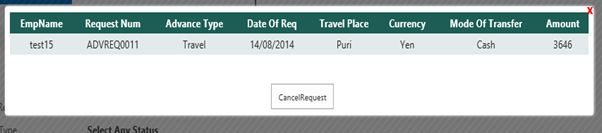 Now on clicking on the Requestid (ADVREQ0011) all the requests related to that Requestid will come from the ChildList (AdvanceRequestType) will be displayed in a popup with a cancel button. If the task is rejected or approved then the cancel button will not be shown.