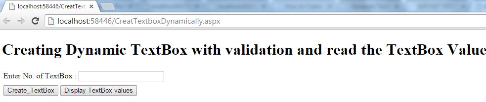 This article explains how to generate a TextBox at the runtime with validation in an ASP.NET Web Application.Look at the following images.Enter the number in the TextBox and click Create_TextBox and it will generate the TextBox.Now, TextBoxes are Created.When you click on “DisplayTextBoxValues” button it will show that Textboxes should not be empty . Now, enter the values into the Textboxes and then click the “DisplayTextBoxValues” Button.Now, the values are displayed from the dynamically created Textboxes.