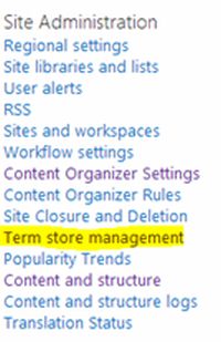 For site collections we can use the Term Store Management Tool. This is available from Site Actions > Site Settings > Term store management tool.