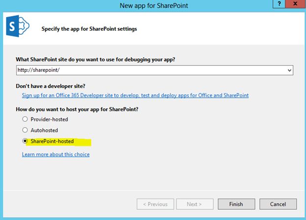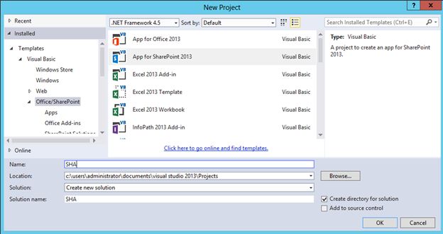 IntroductionA SharePoint Hosted App (SHA) will have all components deployed to a SharePoint server. Optionally there can be JavaScript components running in the client side.App Pre-RequisitesYou should have the following pre-requisites done to create a SharePoint Hosted App.App Development Pre-RequisitesProcedureOpen Visual Studio 2013 in Administrator mode. Choose New Project > SharePoint > App for SharePoint 2013 as shown below.In the next dialog choose the SharePoint-hosted app option.You will get the following items created in the Solution Explorer.Run the application and if the compilation was successful you will get the password prompt.