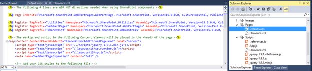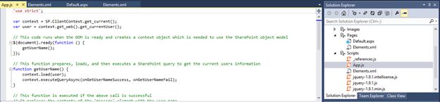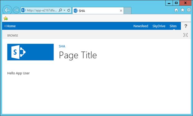 Examining the ContentThe Page default.aspx is the main page.The page displays a Hello message with the current user name. The current user name is displayed using a JavaScript that you can find in the App.js.NoteYou should use a non-System account for developing apps.ReferencesOverview of apps for SharePointSummaryIn this article we saw how to create a SharePoint Hosted App.