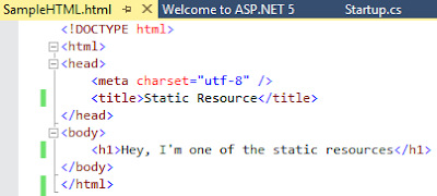 Create a HTML file under wwwroot folder. Below is my sample HTML file named SampleHTML: