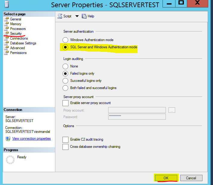 - Click on Security then SQL Authentication and Windows Mixed Mode and click on OK.