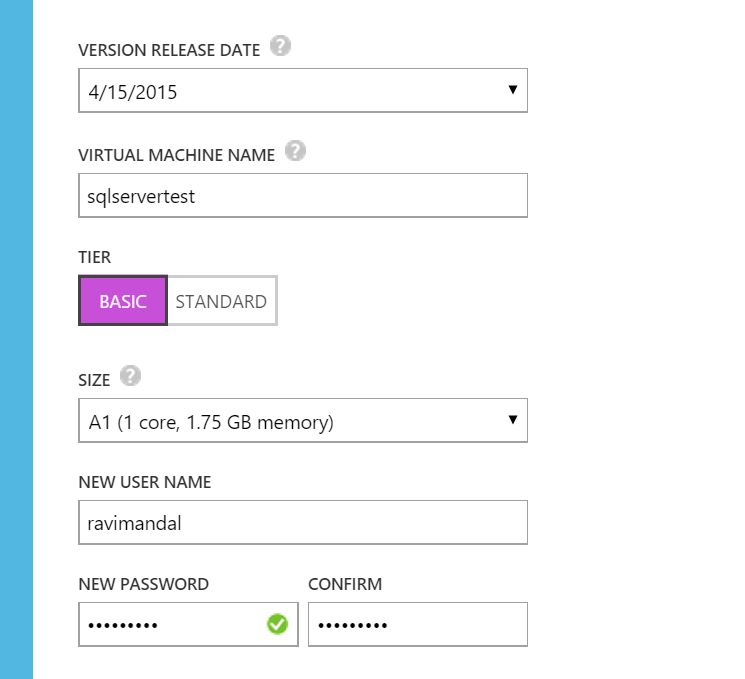 Step 5: Fill in the required fields you are asked. Select release date of the SQL Edition you want to use, machine name, pricing tier, size of the VM and new username and password.