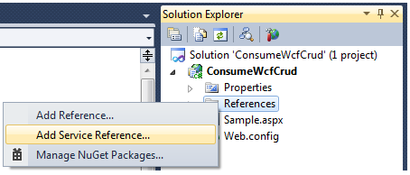To consume/call the WCF service and its methods we need to add the service reference. For that go to Solution Explorer then right-click on the project then select add Service Reference as shown in the following image.