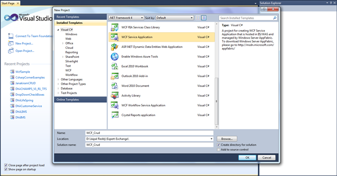 Open Visual Studio then go to "File" -> "New" -> "Project..." then select WCF Service Application and provide it the name " WCF_Crud" as shown in the following image.