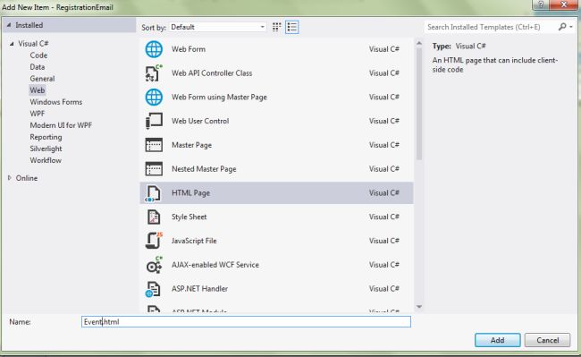 Step 2: Go to Solution Explorer then right-click on your application then select "Add New Item" then select "Html Page" and name it “Event.html”.