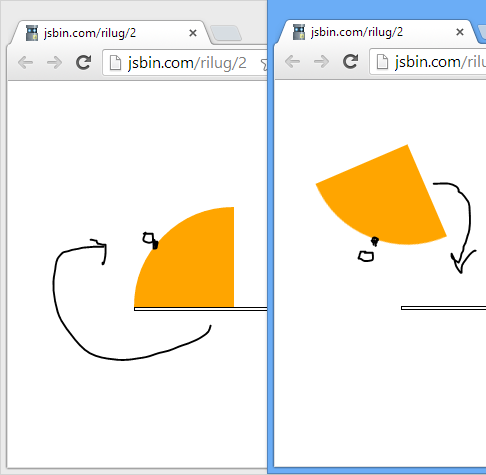 In this example the quarter circle rotates, keeping the origin at the top edge.