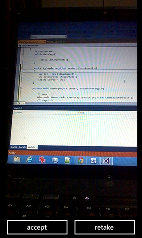 This article explains the camera capture task. We will see how to provide access to the mobile camera from our app to user. Not only that we will also open that photo in our app. For that purpose we will use a Windows Phone task launcher. So let's start.