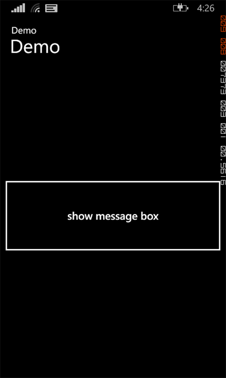 <Button Content="show message box" Click="openMsgBox" Height="171" VerticalAlignment="Bottom" Margin="0,0,0,258" Grid.Row="1"></Button>