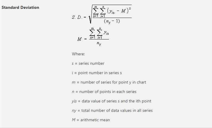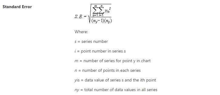 Error bars are a graphical representation of the variability of data and are used on graphs to indicate the error, or uncertainty in a reported measurement (quoted from Wikipedia). Using error bars in Excel chart, we could easily see margins of error and standard deviation. There are 5 options in Excel to set error type: fixed value, percentage, standard deviation, standard error and custom specified value. The difference between standard deviation and standard error in Excel charts lies in different equations, please refer to the following picture from Microsoft Office official website.