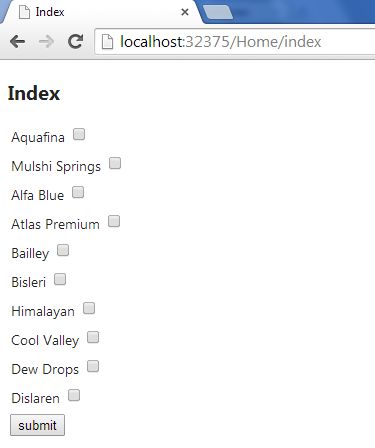 - new CheckModel{Id = 6, Name = "Bisleri", Checked = false},