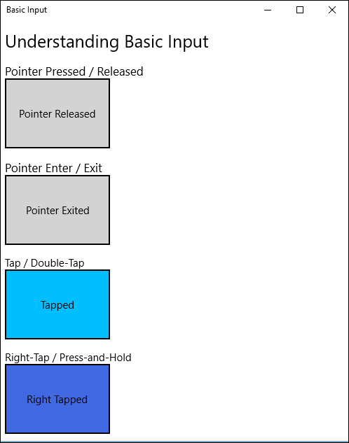 Step 1: Open a blank app with four borders with a text block child to it by copying the following XAML code in to your page. Please have a look at the different events assigned for each.