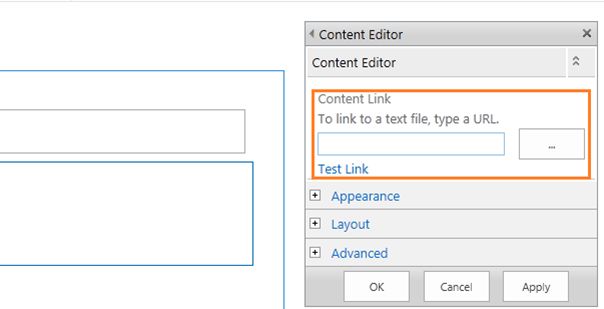 - In the Web Part properties, we have a Content Link TextBox. There we need to provide the HTML file the URL as input. For example, http://sharepointsite/siteassets/WebInfo.html and click to save the web part with the contents from the HTML page.