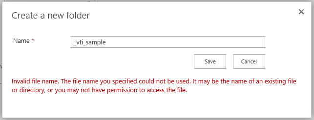Common Invalid strings for File Names and Folder NamesThe string “_vti_” should not be used in the beginning of a file name or folder name. If we try to create a folder name with “_vti_” then it gives the following error: