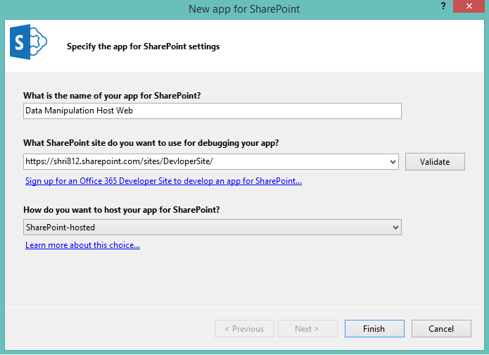 Step 1: Create SharePoint Hosted App with Office 365 account credentials. Open Visual Studio and select New Project as in the following,