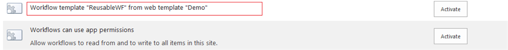 Step 4: Enable feature at site level. Go to site setting, then manage site feature. New workflow feature listed there as shown in image. We need to activate it.
