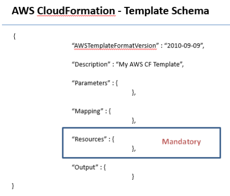 A template is a JSON-formatted text file that describes your AWS infrastructure. Templates include several major sections. The Resources section is the only section that is required. You can use AWS CloudFormation's sample templates or create your own templates to describe the AWS resources and any associated dependencies or runtime parameters required to run your application.