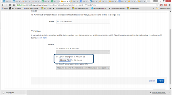 - Type Stack Name and choose Cloud Formation Template that you created in Step 1.