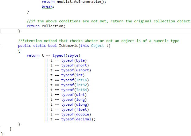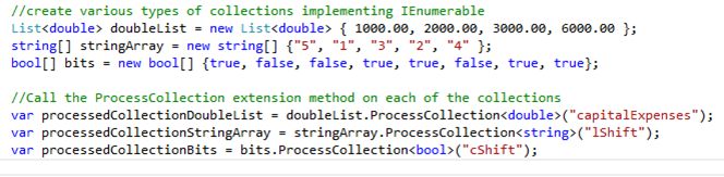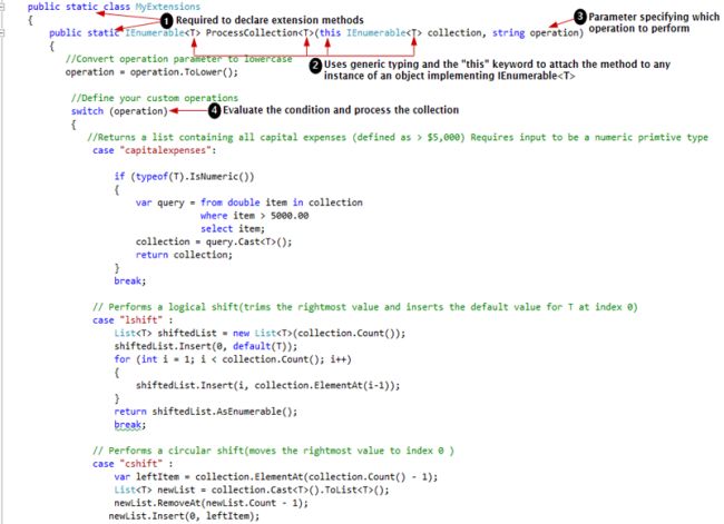 We begin by creating a static class called “MyExtensions” that will serve as a wrapper for our extension methods (extension methods must be defined as static methods within a static class). Our first method, ProcessCollection<T>, is attached to the IEnumerable<T> interface by applying the “this” keyword to the first parameter. Note that by using generic typing (as indicated by <T>), we ensure we can use this method on any enumerable collection, regardless of the type of its elements (i.e. List<int>, List<string>, Object[], etc.). The purpose of our second parameter is to provide a way for the caller to specify which custom operation to invoke. The main processing component of the method then begins at the case statement, where an evaluation is performed to determine which custom operation to execute.