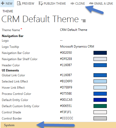 Microsoft Dynamics CRM 2015 Update 1 introduced a very nice feature, “Themes” , which allows us to add colors to different below components in supported way. We can access theme by navigating Settings->Customizations-> Themes. There is one default read only, out of the box theme available in every CRM deployment. We can’t do any modification to this theme but we can make new custom theme or can make clone of existing default theme using Clone button available in command bar.