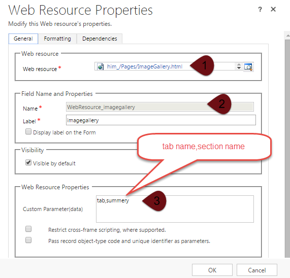 - Double click on tab and make note of tab name, follow similar steps for section and make note of section name, we need to pass these to web resource.