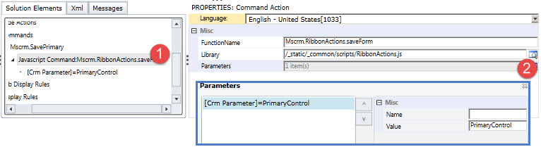 Select Mscrm.SavePrimary under Commands and click on Actions lookup to check for function name and parameter, we got this command name from the Save button commandcore property.