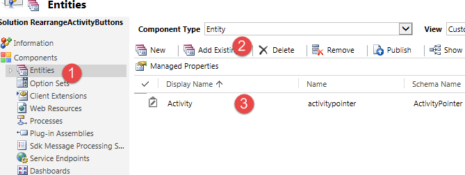 - Click on Entities -> Add Existing Entity and select an activity entity as in the following: