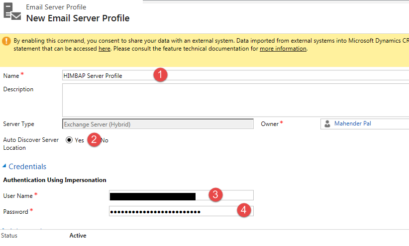 Fill server profile name and fill exchange service account details like below and click on Save & Close: