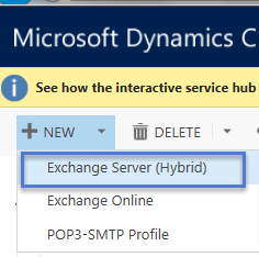 So let’s first set up server profile; we are going to use server-side synchronization for this integration. To set up server profile navigate to Settings, then Email Configuration and click on Email Server Profiles. Click on NEW drop down and select Exchange Server (Hybrid) option.
