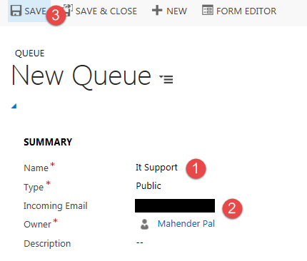 Now let’s setup support queue; navigate to Settings-> Service Management and click on Queues. Enter queue name and fill support email address like below and hit SAVE button. As soon as queue record is created, CRM will create a corresponding mailbox record and fill the mailbox lookup in the queue record.