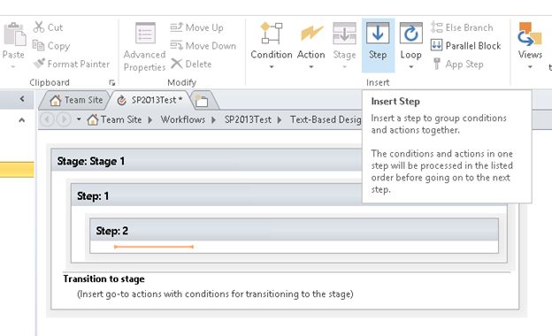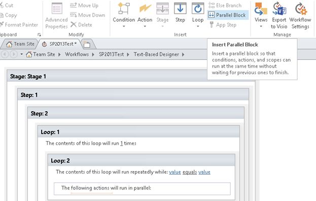 - The most important tab, Insert, where we have conditions, actions, stage, step, loop, branch and parallel blocks.