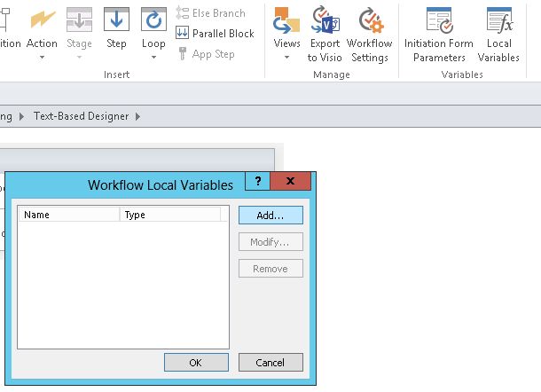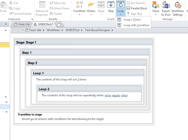 - Then we have the manage tab that contains Views, an Export to Visio and Workflow Settings.