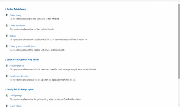 Audit Log ReportsThis feature is the same as the previous versions where the reports are generated on content viewing, content modifications, deletion, Content Type and list modifications all related to content activity reports. Then we have Information Management Policy Reports that contain Policy modifications and Expiration and Disposition. Then under Security and Settings Reports we have Auditing settings, Security Settings and finally under Custom Reports we have to run a custom report that you can configure your filter yourself to generate a report.