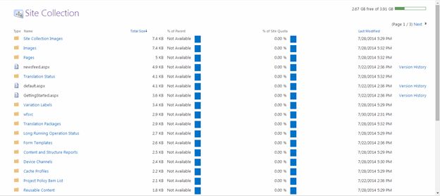 Storage MetricsHere as we can see it contains the size of the site on the right corner and all the contents below.