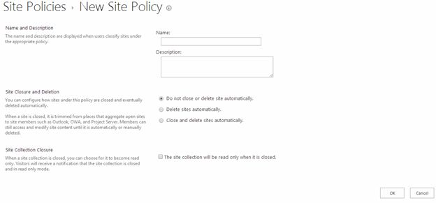 Site PoliciesHere you can create a new Site Policy providing a Name and Description. Then we have rules to have Site Closure and Deletion configuration where we have three the following options: