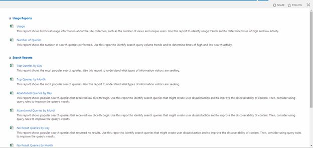 Usage: This report shows historical usage information about the site collection, such as the number of views and unique users. Use this report to identify usage trends and to determine the times of high and low activity.