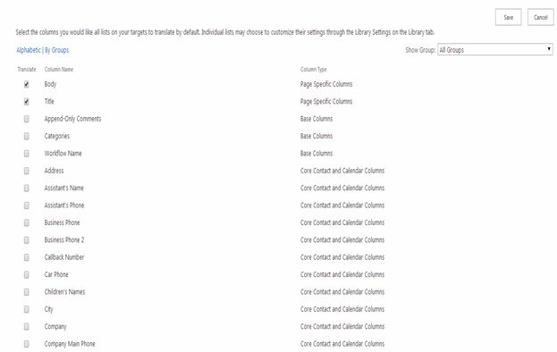 Here you can select the columns you would like all lists on your targets to translate by default. Individual lists may choose to customize their settings through the Library Settings on the Library tab.