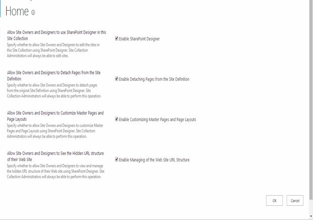Here we see SharePoint Designer Settings for the first time where a developer can configure SharePoint Designer to be enable or disable on the site, then we have Enable Detaching Pages from the Site Definition where it states whether to allow Site Owners and Designers to detach pages from the original site. Then we can see Enable Customizing Master Pages and Page Layouts, where Owners and Designers can be assigned access to Master Pages and other Page Layouts and finally Enable Managing of the Web Site URL Structure to provide them with access to allow structuring of their web site using the Designer.