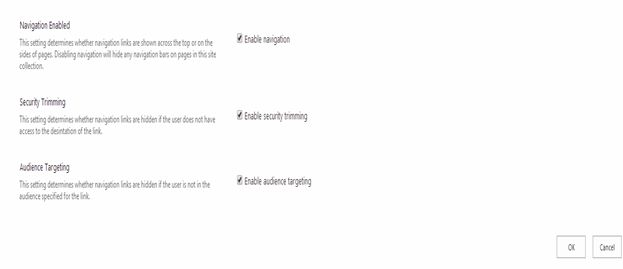 Site Collection NavigationThis contains the site collection navigations that contains options to enable Navigation Enabled like the Left Navigation and Global Navigation, then we have Security Trimming and Audience Targeting to be enabled to all the sites in the Site Collection.