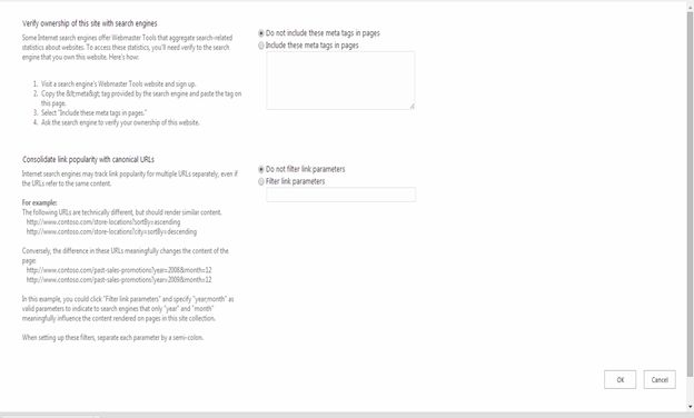 Search Engine Optimization SettingsHere in the search engine optimization settings we can see it optimized by adding metatags to the pages. You also have an option to filter the link parameters to avoid a link based on popularity coming up as the search option.