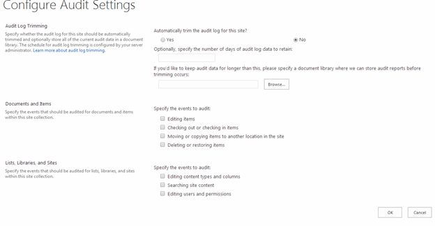 Site Collection Audit SettingsIt is a beautiful feature to track down the log files for changes in the site contents like Editing items, Checking out or checking in items or moving or copying items to another location in the site and lastly deleting or restoring items.