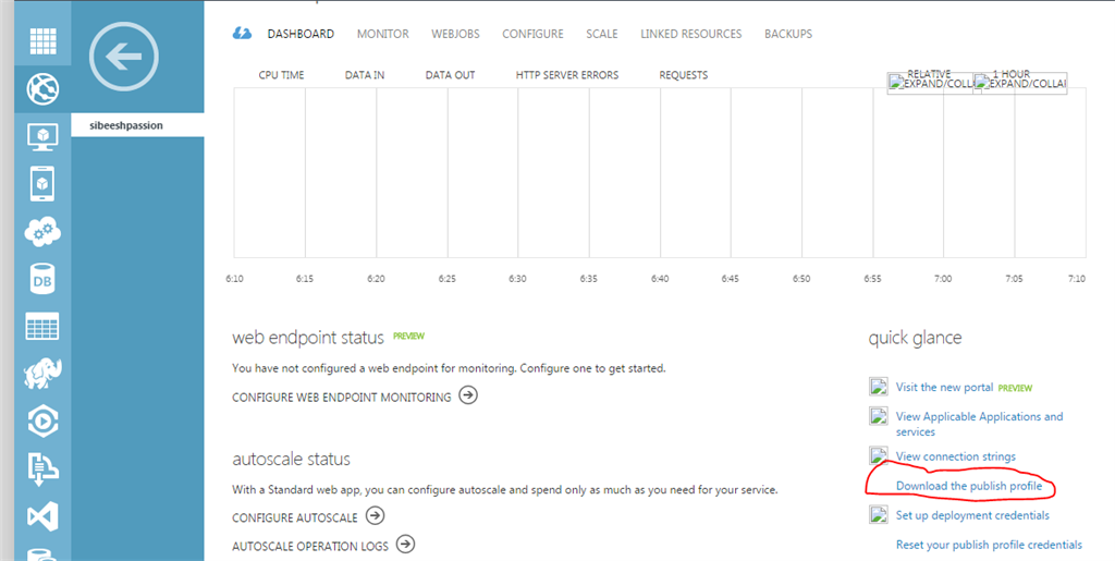 Click on the Dashboard and download the publish profile.