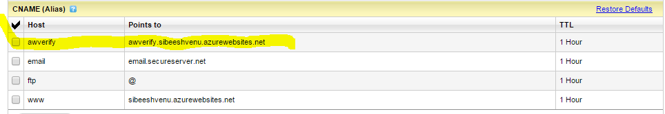 Make an entry in CNAME host as "awverify" and point it to verify your Azure website URL (for example awverify.sibeeshvenu.azurewebsites.net).