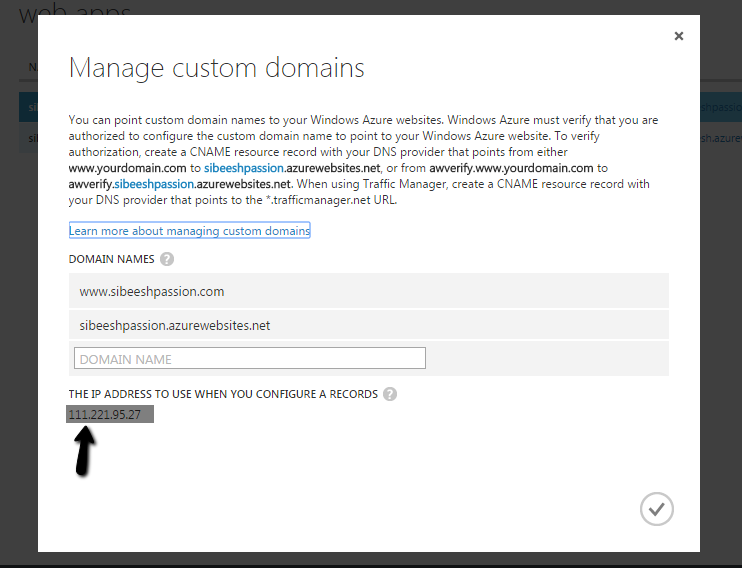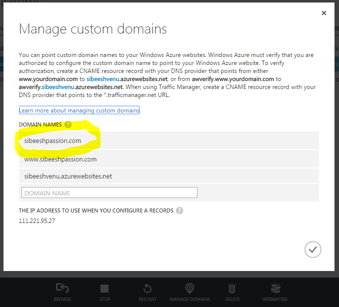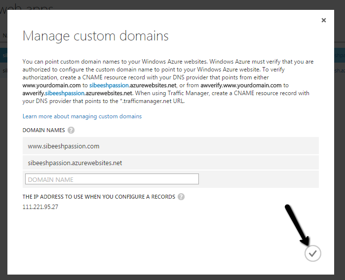 Now it is time to add this entry into your Azure manage domain. Please add an entry for your website without www as shown below.