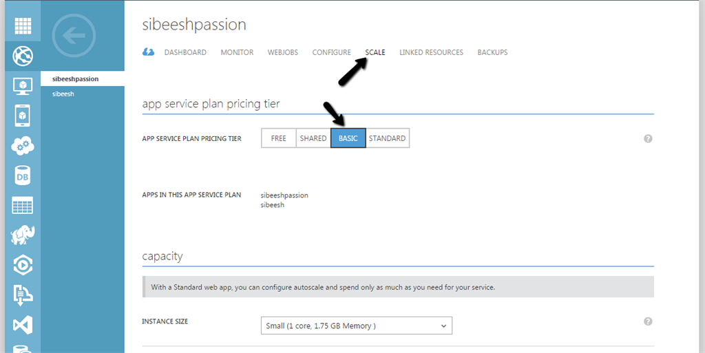 Now you will be redirected to a page, where it will ask for some details like IP address. To get this information, please login to your Azure account and click on Web App and then Scale. Select BASIC from the APP SERVICE PLAN PRICING TIER. (It may be different depending on your hosting plan.)