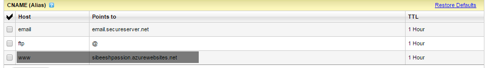 Now what will happen if you type sibeeshpassion.com alone without www? It will throw you an Azure error. So to resolve this you need to return to your GoDaddy DNS server and add another entry.