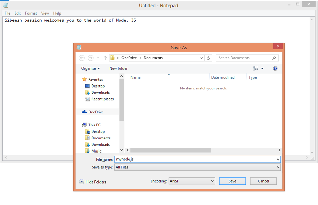 I typed the content as “console.log(‘Sibeesh passion welcomes you to the world of Node’);”.