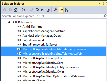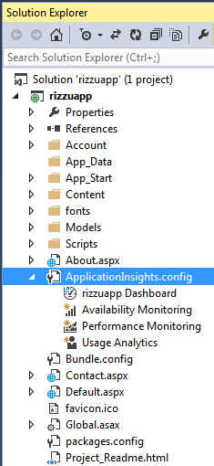 When you add this to your project then you see in the Solution Explorer an ApplicationInsights.Config; there are the following four files.