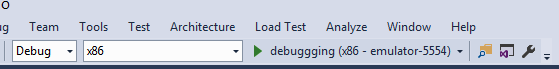 After this in your Visual Studio menu option you can see something like this. The emulator comes automatically at the start up point, but it remembers that *86 was selected, not ARM from the drop down list.